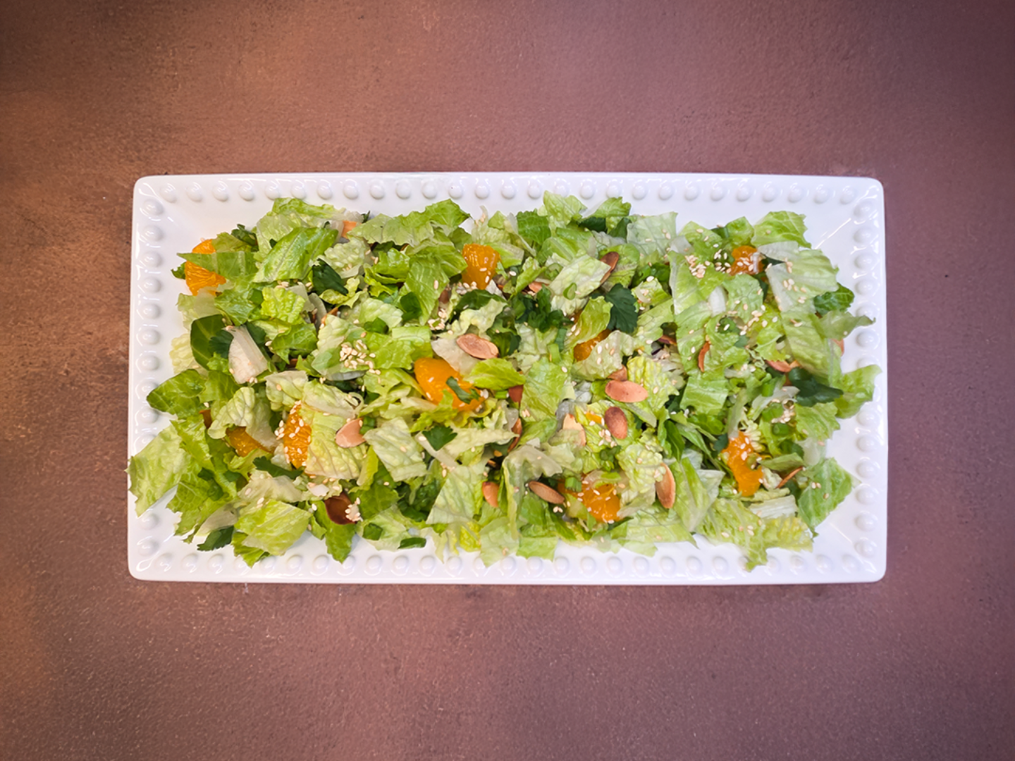 Hand cut romaine lettuce, avocado, green onions, mandarin oranges, toasted almonds and sesame seeds, and sesame dressing.