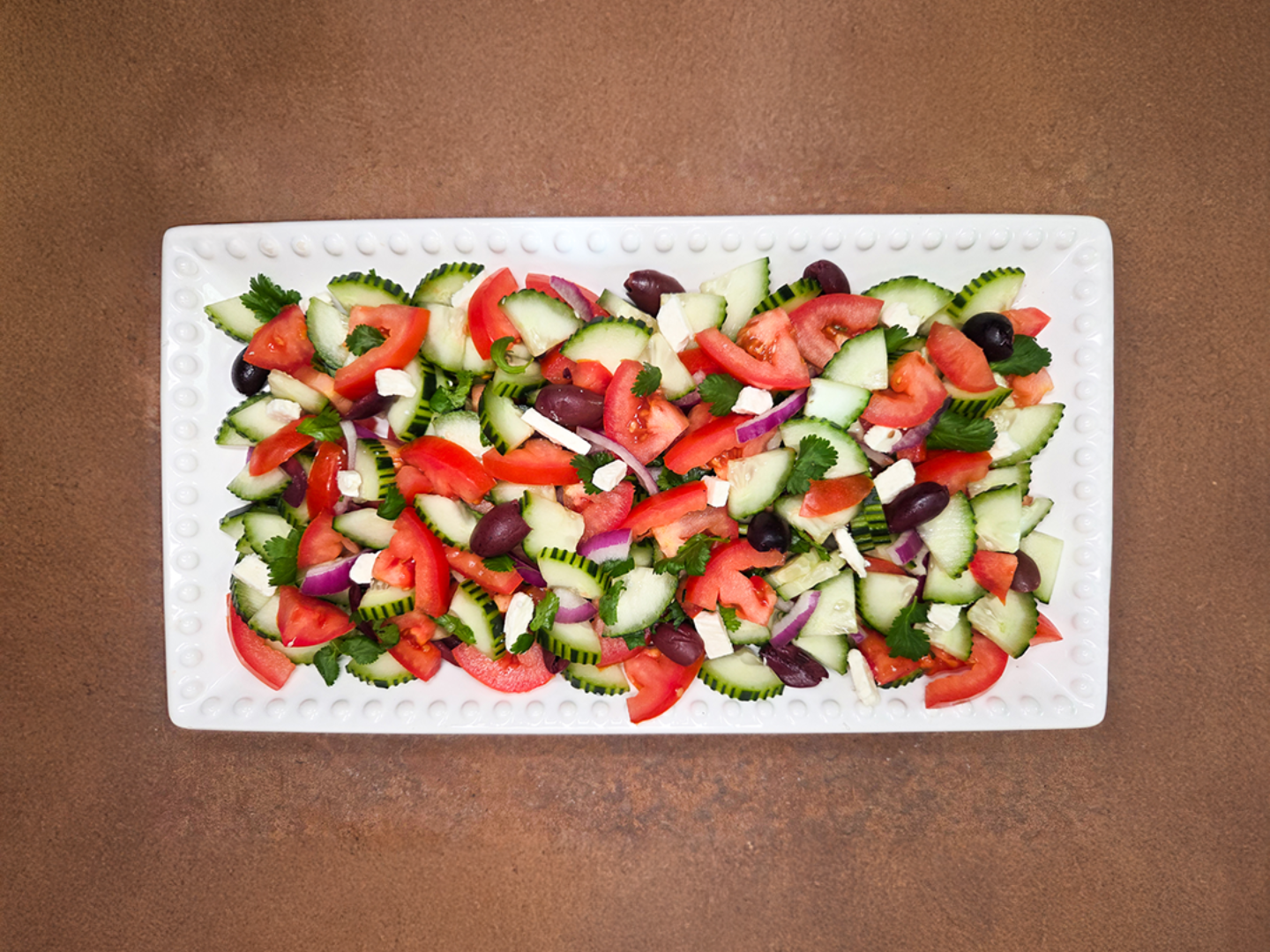 Hand cut tomatoes, cucumber, red onion, cilantro, kalamata olives, fresh feta cheese, EVOO and cider vinegar dressing.